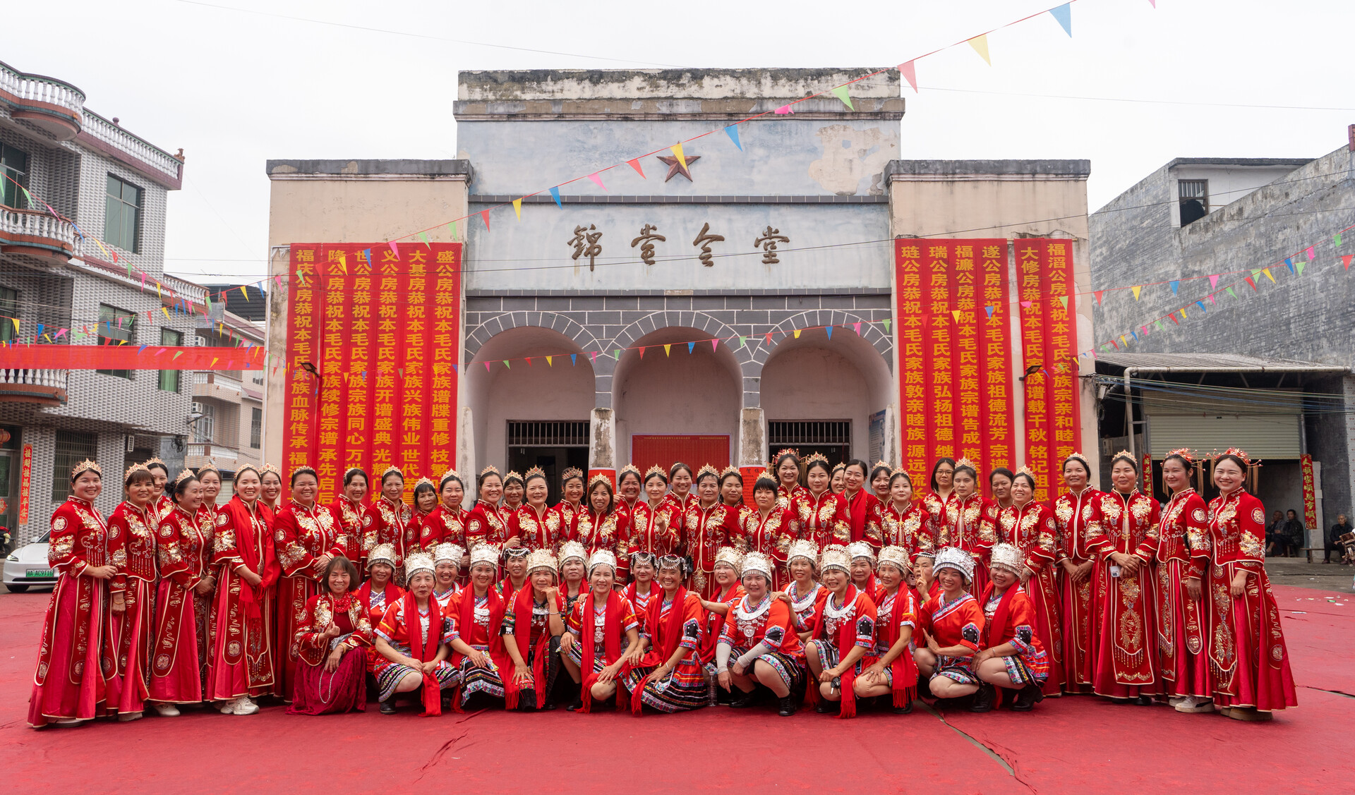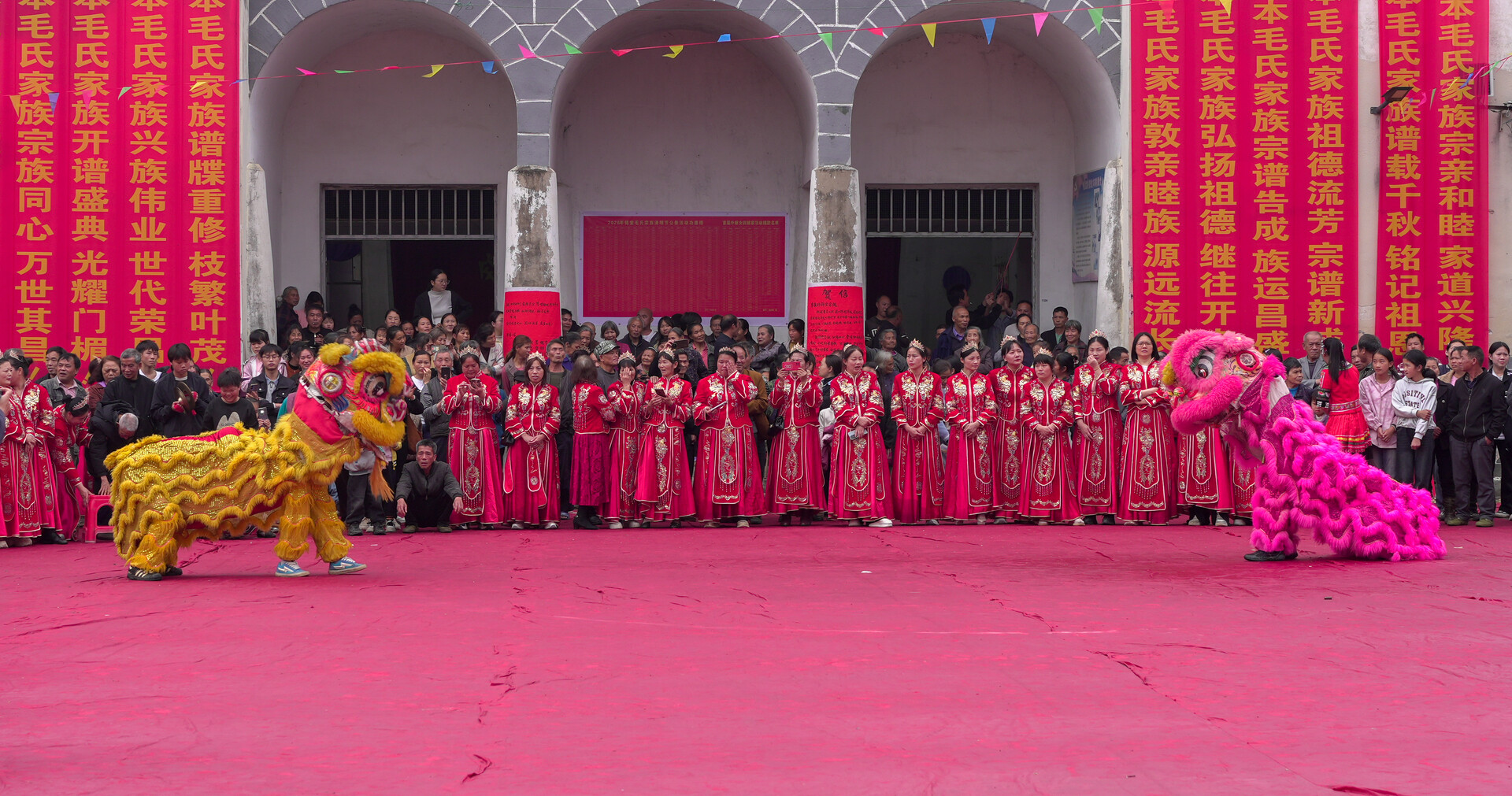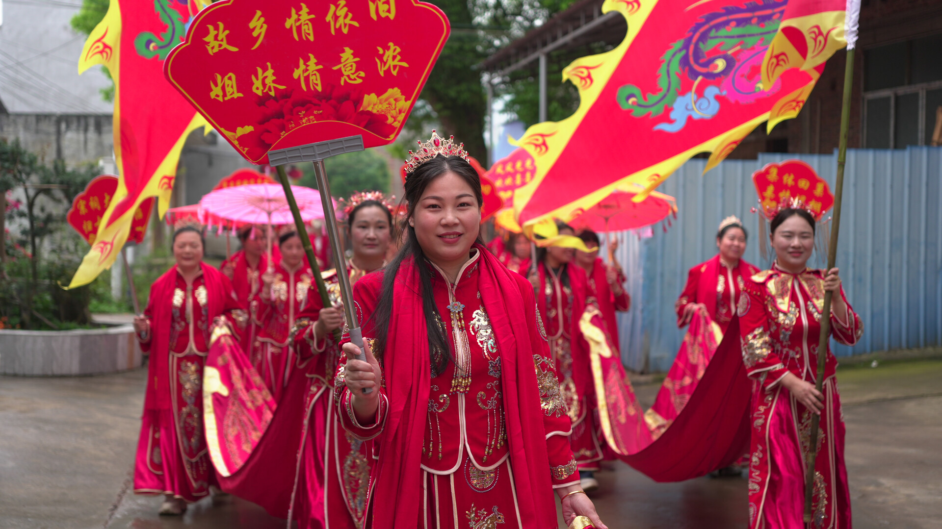 当天上午,身着红色中式嫁衣的外嫁女们精心装扮、列队整齐,手持“昔日同饮家乡水 今朝共叙姐妹情”“家灯为我亮 我为家归航”等标语沿村道缓缓游行,向家乡深情致意。村里张灯结彩、锣鼓喧天,乡亲们铺红毯、舞龙狮、鸣鞭炮,以最隆重的礼仪迎接归家的 “女儿们”。在锦堂大礼堂前,外嫁女与村媳妇们携手演绎大型舞蹈《回家了》,熟悉的旋律《常回家看看》响彻广场,引得现场阵阵喝彩,浓浓亲情浸润全村。